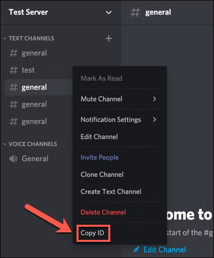 With developer mode active, you can copy ID values for users, channels, and servers by right-clicking the server name, channel name, or username and selecting the "Copy ID" option.