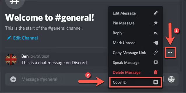 To copy a message ID, hover over any posted message, then click the three-dot menu icon. From the menu, select the "Copy ID" option.